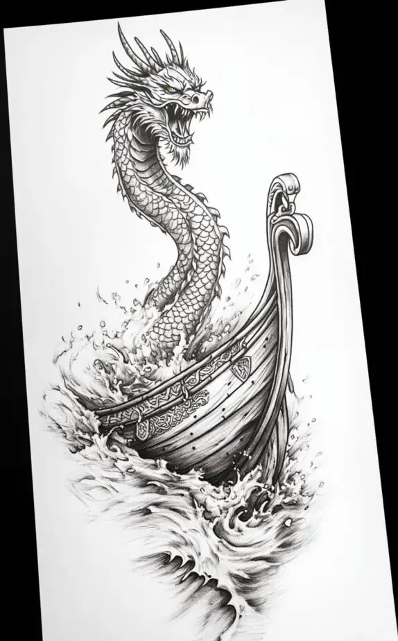 This Viking-inspired tattoo features a fierce dragon emerging from a ship, symbolizing adventure, bravery, and the spirit of exploration. The intricate patterns and the roaring dragon head capture the essence of Norse mythology, making it an ideal choice for men with a warrior spirit. The dragon s fierce expression and the waves crashing around the boat create a dynamic scene, representing the courage to face life s challenges head-on.