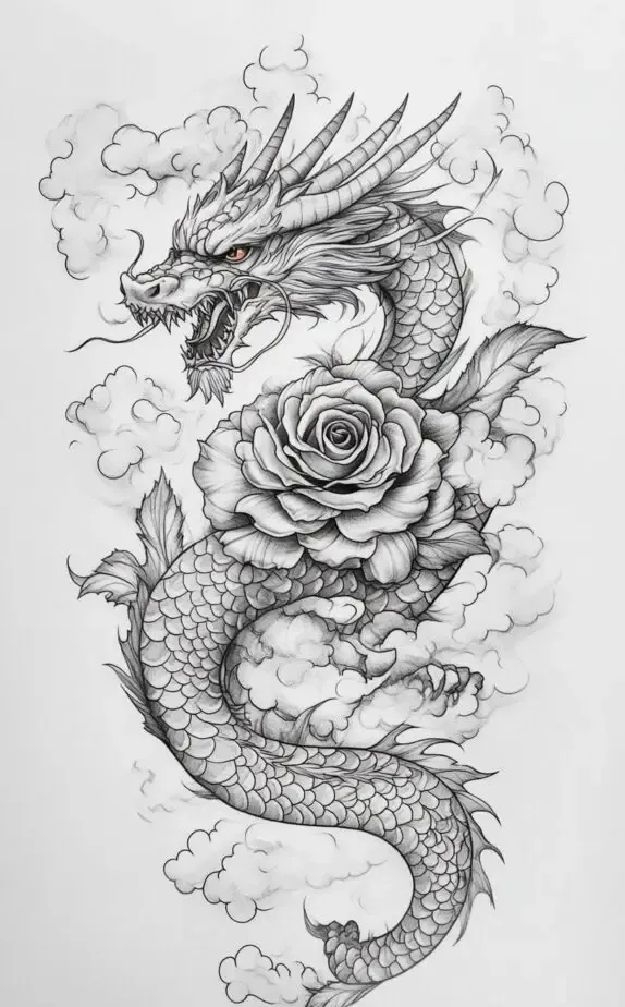Combining a dragon with a rose creates a tattoo that is both fierce and gentle. The dragon, representing strength and protection, entwines itself with a delicate rose, symbolizing love and beauty. This design is ideal for those who want to show both their powerful and sensitive sides, balancing intense energy with tenderness.