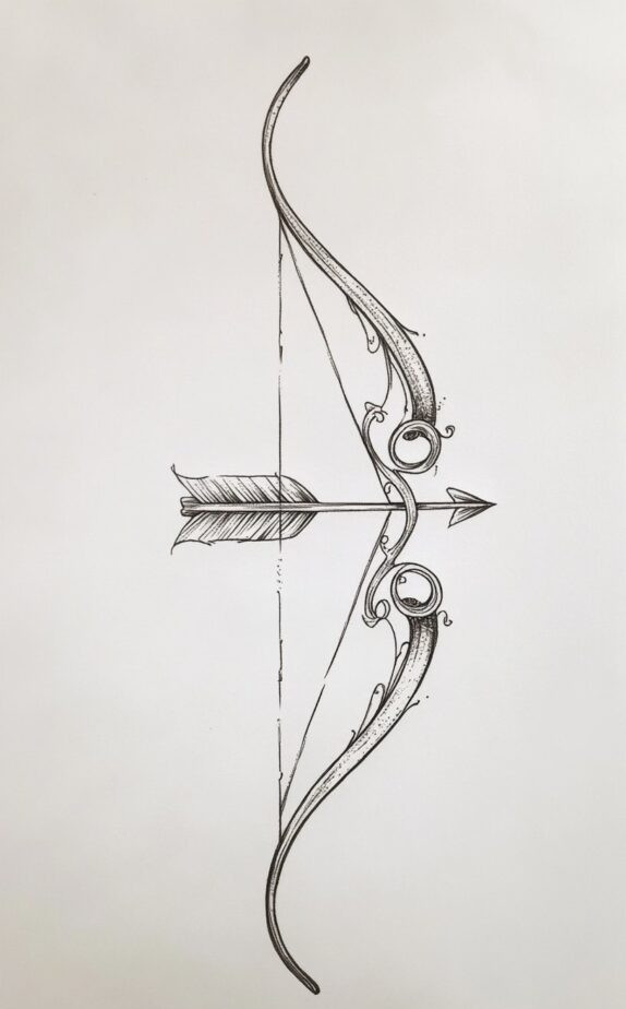 This elegant bow and arrow tattoo drawing represents focus and determination. The bow s graceful lines and the pointed arrow symbolize the pursuit of goals and the drive to move forward. For women who want to convey their ambitious nature, this tattoo is a powerful yet subtle choice. The design s simplicity makes it perfect for areas like the forearm or along the spine, offering a timeless look with a hint of strength.
