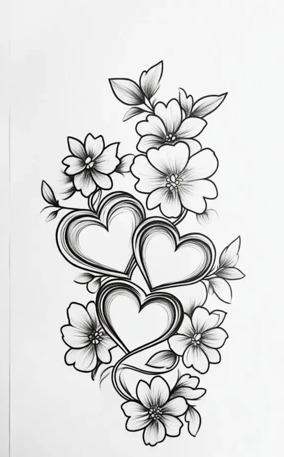 Combining hearts and flowers, this tattoo drawing represents love and affection. The intricate floral design intertwined with the heart shapes creates a harmonious composition that s both feminine and expressive. This design is ideal for women looking to symbolize love, whether it s self-love, romantic love, or familial bonds. It s a charming piece that would work beautifully on the forearm or shoulder.