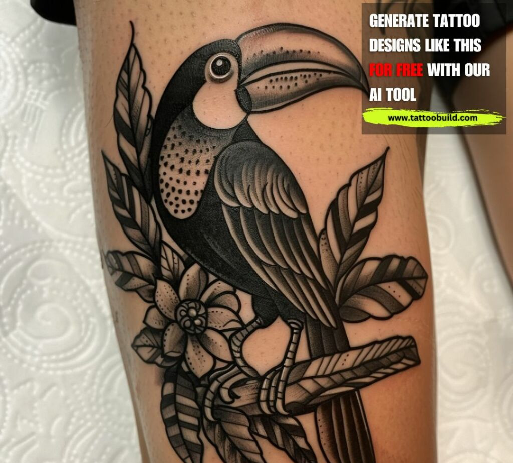 Black and gray traditional bird tattoos are incredibly versatile. This is so in terms of placement, lending themselves well to a variety of body parts and anatomical contours. Additionally, their monochromatic color scheme makes them suitable for both large-scale, full-body pieces and smaller, more discreet tattoos.
