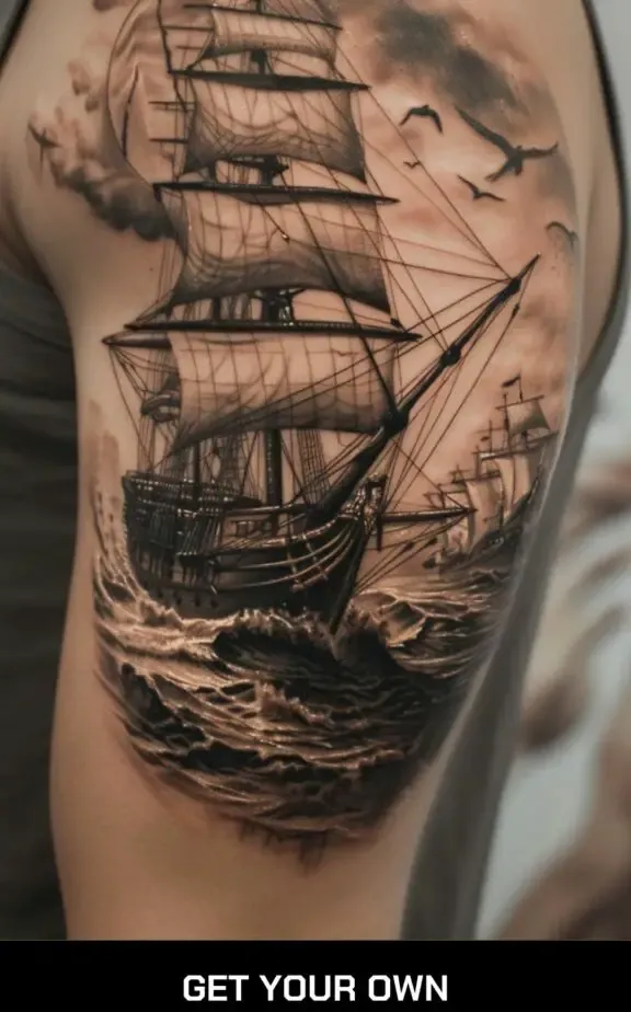 A ship tattoo, symbolizing adventure and exploration, paired with a compass, represents direction and guidance. This combination is perfect for those who love maritime travels and the stories of ancient explorers. The ship can be designed to sail around the compass, creating a cohesive and adventurous piece.