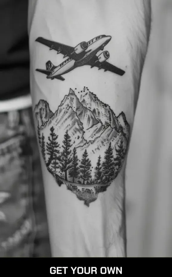 An airplane flying over a mountain range creates a dynamic and captivating travel tattoo. The mountains symbolize adventure and resilience, while the airplane represents the freedom and thrill of travel. This combination is perfect for those who love both flying and exploring nature.