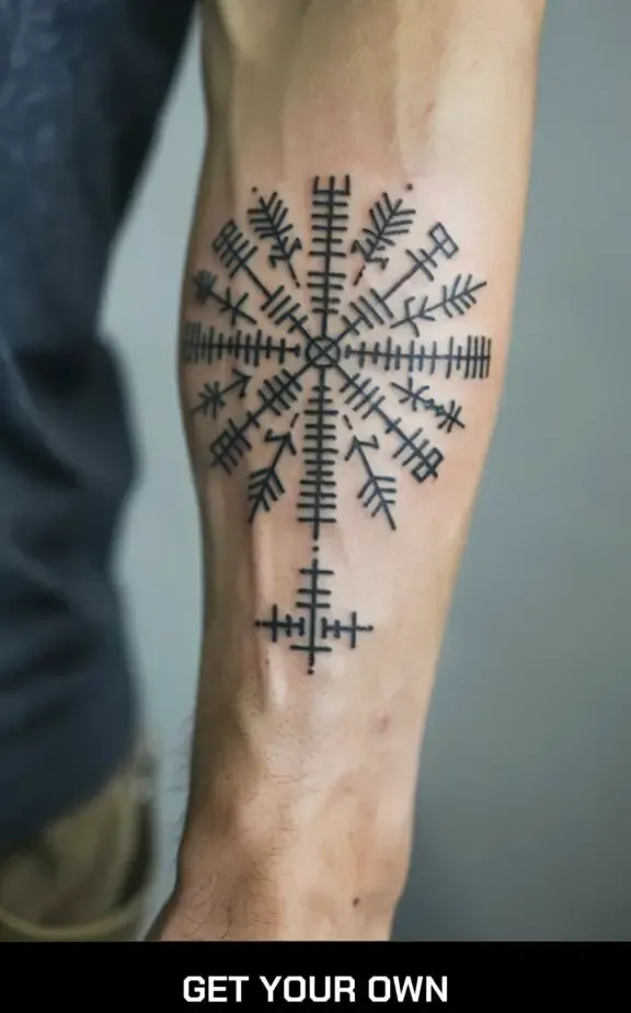 The Helm of Awe is a magical symbol believed to provide protection and induce fear in enemies. A tattoo of the Helm of Awe can symbolize courage, protection, and the ability to overcome adversities.