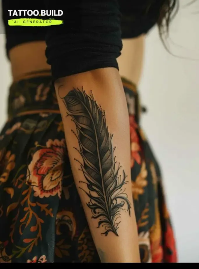 The feather s positioning allows the intricate details and shading to stand out prominently against the skin s surface.
