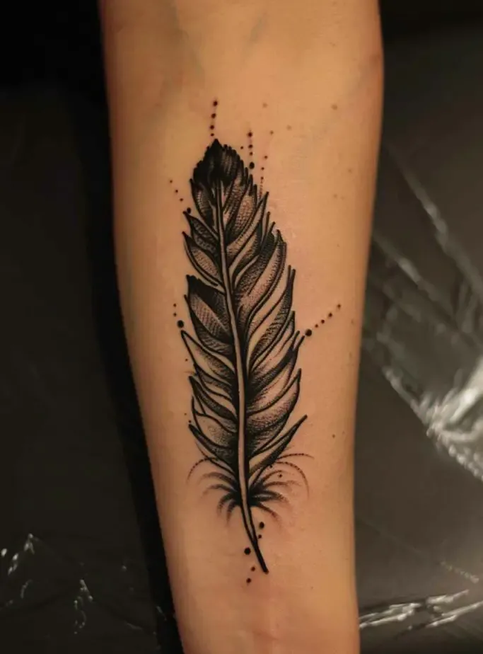 Small dots or specks are also incorporated into the design around the feather, adding a subtle decorative touch.